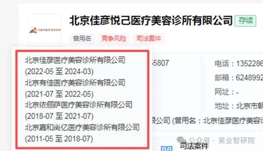 值得注意的是,北京佳彦悦己医美多次更名的行为也十分可疑。从其工商信息变更记录可以发现,在过去的经营过程中,北京佳彦悦己医美曾频繁更换名称。频繁更名或许是为了逃脱因违法违规行为而产生的责任。一旦被消费者投诉或者受到监管部门处罚,更换名称后,新的名字可能会让消费者难以将其与之前的负面事件联系起来,从而继续招揽新的顾客。