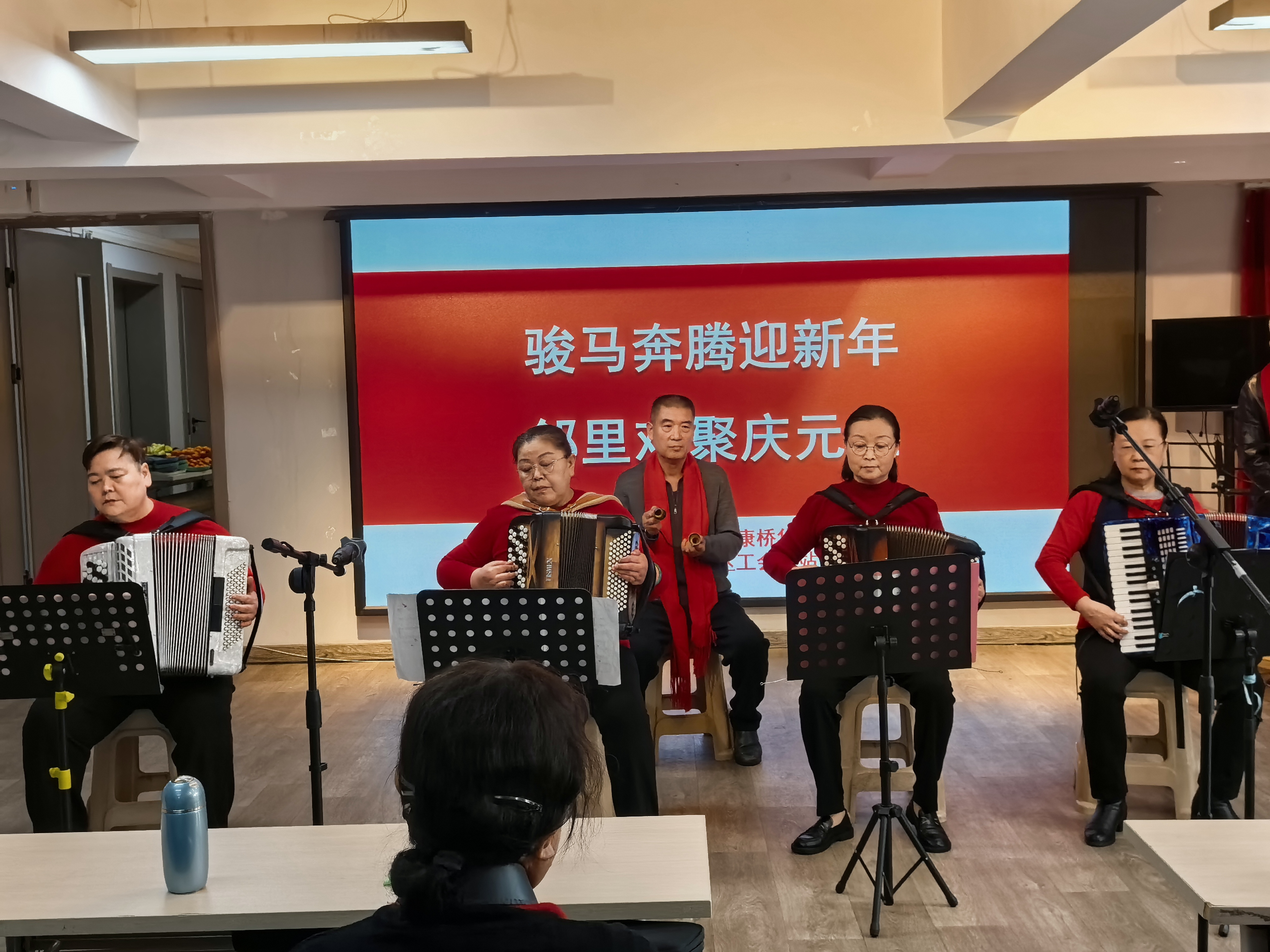 活动伊始,社区文艺爱好者带来的《2026年好运来来来》舞蹈节目拉开了活动帷幕。随后,集体诗朗诵《诗韵满华城》《满江红》、手风琴合奏《美丽的草原我的家》《山楂树》、独唱《天边》《我把最美的歌儿唱给妈妈》、口琴演奏《志愿军进行曲》《人民军队忠于党》、乐队演奏《步步高》等形式多彩、内容丰富、群众喜爱的节目轮番登场,有深情款款的歌曲串烧、有诙谐幽默的小品表演,还有激人奋进的红歌传唱,都收获了现场观众的阵阵好评。