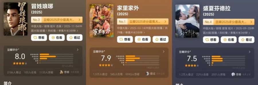 精品化是内容生产端的主旋律。历史题材短剧《冒姓琅琊》豆瓣斩获8.0高分,热赞评论为“没想到在一部短剧里找回中华文史的博大精深”;都市赛道跑出了靠镜头美学出圈的《盛夏芬德拉》,细腻的情感和唯美的画面让不少从未看短剧的人垂直入坑;还有方言现实故事《家里家外》、IP养成的领头羊《太奶奶》系列……