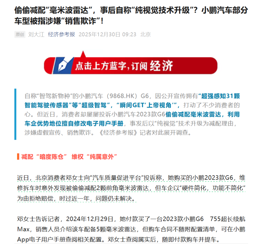 据《经济参考报》调查核实,北京消费者邓女士的遭遇颇具代表性。2024年12月29日,邓女士购置了2023款小鹏G6755超长续航Max版本,购车时销售人员明确告知该车配备5颗毫米波雷达,小鹏App电子用户手册也标注了相同配置。