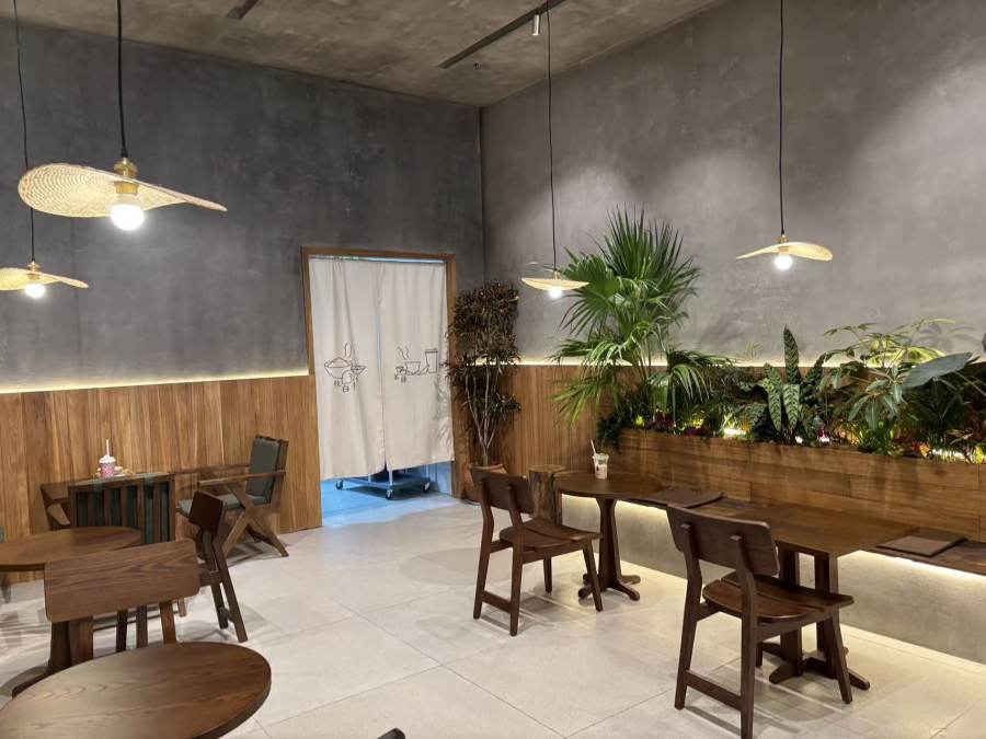 该店面积达156平方米,店内设置了多个座位,相比30平米左右的常规店大了数倍,为员工操作和顾客休息提供了更充裕的空间。店内装修风格以原木风为主,搭配了灰色工业风墙面与绿植,整体呈现出安静和谐的氛围。