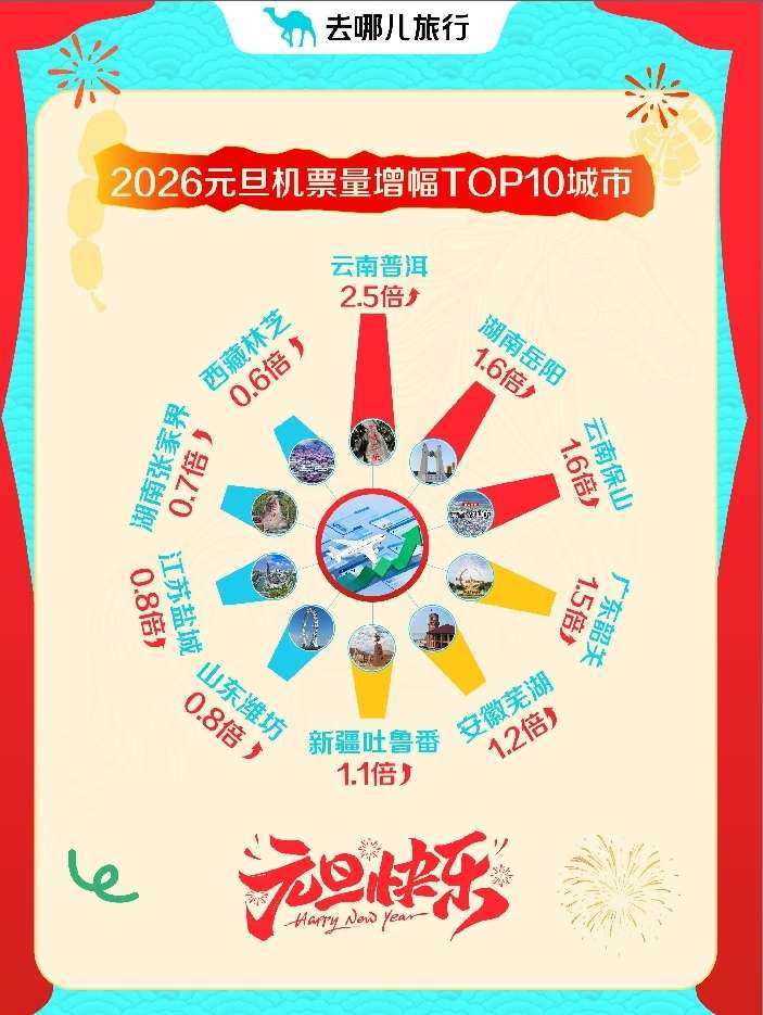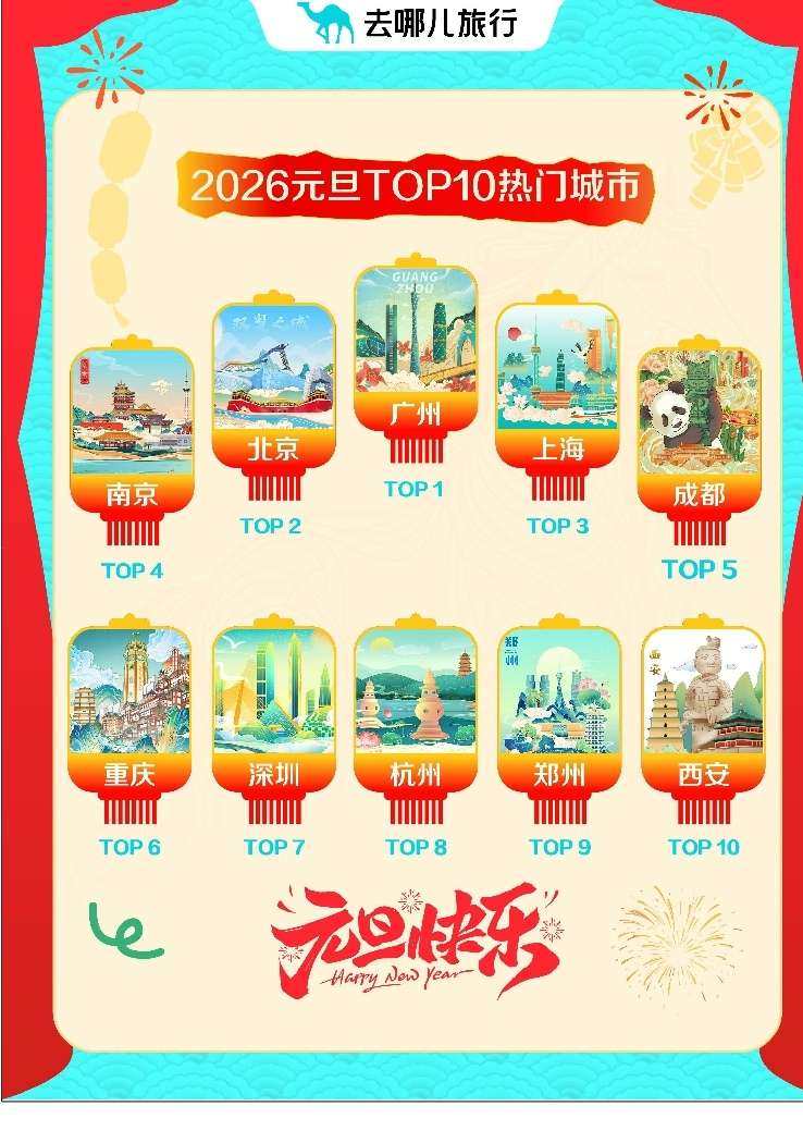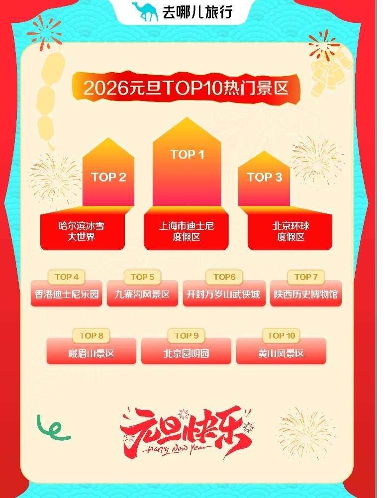 哈尔滨冰雪大世界、河南开封万岁山武侠城等中式主题乐园表现亮眼,首度挺进全国热门景区前十,万岁山武侠城周边酒店预订量猛增9倍。 更多旅客选择“请3休8”,用一次飞行打开2026年。去哪儿旅行数据显示,元旦假期,热门目的地机票量同比增两成,飞往云南普洱等小机场城市机票量增逾2倍。还有不少年轻人热衷出境跨年,去哪儿旅行用户预订了全球近3000个城市的酒店,23-30岁旅客购买出境机票增42%。 与此同时,越来越多的外国朋友选择来中国跨年。去哪儿旅行数据显示,元旦假期期间,持非中国护照购买国内航线目的地覆盖了97个城市。封关后的首个小长假,海南文旅市场火热,入境三亚的外国游客同比增5倍。 中式主题乐园首度挺进热门景区前十 元旦3天假,哪里人最多?去哪儿旅行数据显示,主题乐园是跨年顶流。在TOP10景区里,主题乐园占据一半。此外,不少游客选择在元旦登高祈福。峨眉山、黄山,都“长”满了旅客,是元旦最热门景区。峨眉山寺院自1月1日免费进入,景区热度进一步增长,拉动峨眉山周边酒店元旦预订量同比增1倍以上。
