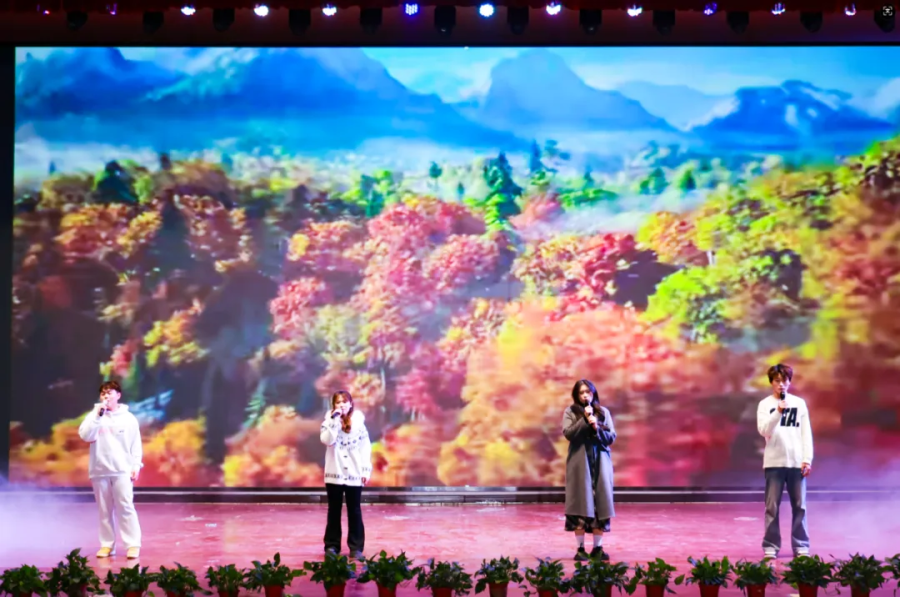 歌曲联唱登场前,一曲悠扬深情的二胡独奏率先拨动全场心弦,为后续的歌声铺垫了浓郁的情感基调。师生登台献唱,以嘹亮歌声演绎经典曲目,字里行间满是青春朝气与对未来的美好憧憬。时而,轻快活泼的流行曲点燃全场节奏,台下观众随旋律轻拍双手;时而,深情悠扬的经典老歌缓缓流淌,熟悉的旋律唤醒共同的青春记忆,不少师生轻声附和、温情合唱。每一首曲目都被赋予全新生命力,阵阵歌声交织成温暖的乐章,在校园夜空久久萦绕。