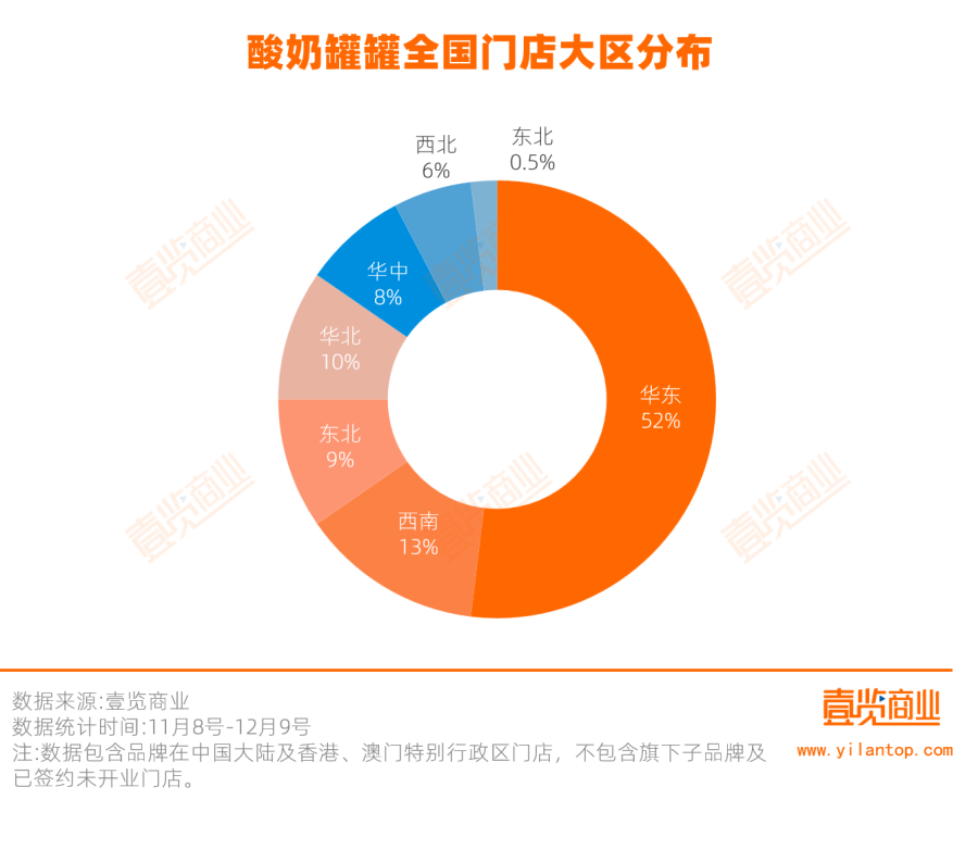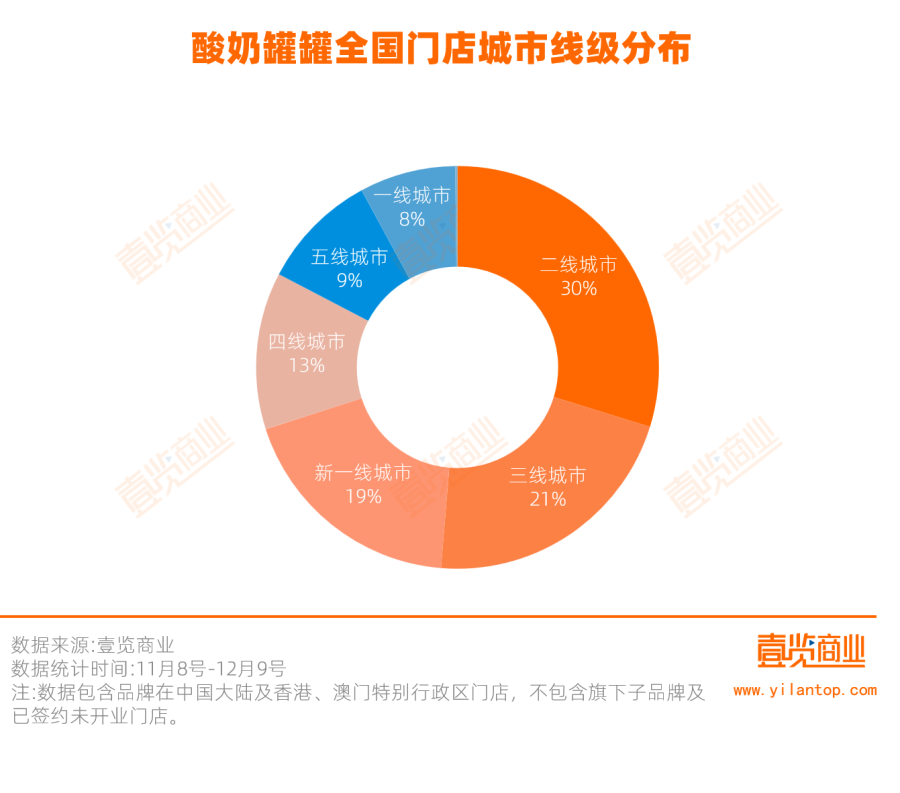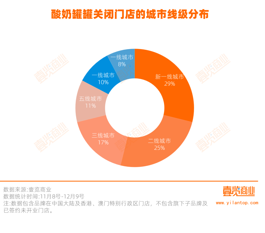 数据印证了这一判断。据茶咖观察统计,11月8日至12月9日期间,酸奶罐罐关闭52家门店,其中新一线城市关店数量占闭店总数的28.85%,且高达86.54%的门店位于购物中心。