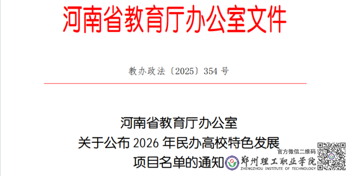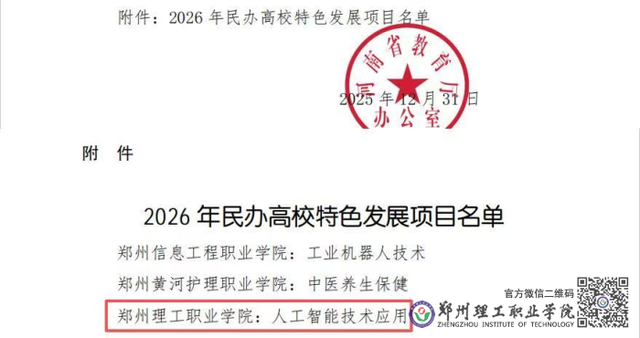 近日,省教育厅公布了2026年度民办高校特色发展项目名单,郑州理工职业学院人工智能技术应用专业成功获批河南省民办高校专业建设类特色项目,这是该校持续推进专业内涵建设、深化教育教学改革取得的又一标志性成果。