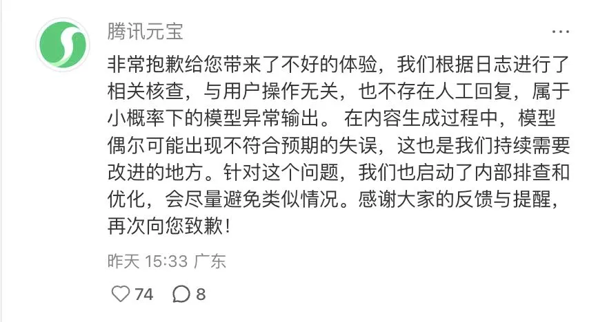 最后,腾讯元宝向受影响用户致歉,并感谢社区的及时反馈:“您的提醒对我们非常重要,我们会继续打磨产品体验,让腾讯元宝更可靠、更专业。”
