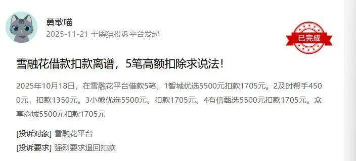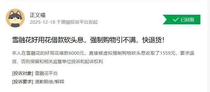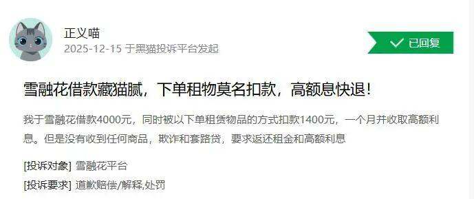 2025年11月24日,有用户在黑猫投诉平台反映,10月24日、26日及11月5日,在雪融花共借款3笔,每笔4500元。平台均以购物名义划扣“砍头息”,导致一个月内偿还两期利息,综合年化利率高达1200%。