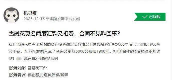 去年12月16日,另一用户投诉称,在雪融花平台点击查询额度后,在未经确认的情况下,账户便收到5000元汇款,随即被扣款1900元用于购买手链。其在不经意间再次点击查询后,再次被扣1900元。客服表示无法退款,且用户无法查看贷款合同。