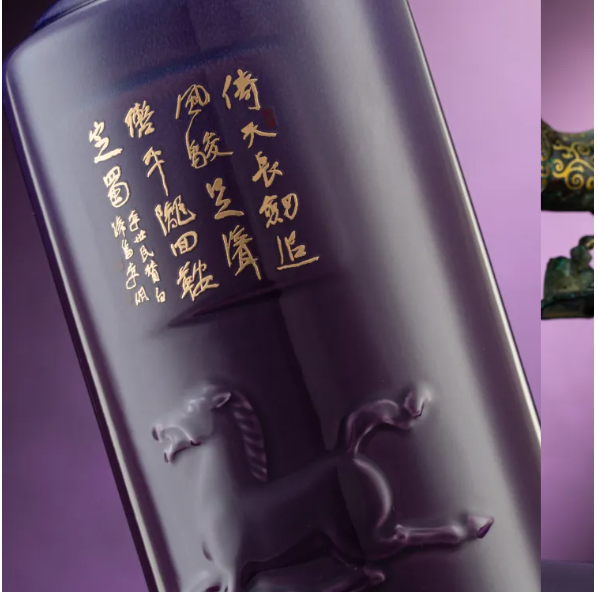 瓶盖采用直筒盖造型,通过非遗“错金银”工艺表现形式,将生肖马的形象与传统纹样结合,细腻纹饰与瓶盖简约造型相得益彰。瓶身采用传统釉彩,以雕刻技艺将中央美术学院教授王少军先生创作的“马踏祥云”作品融入瓶身,塑就天马神韵。同时,融入中国国家画院研究员李明先生创作的书法作品,正面嵌入一级美术师魏杰先生创作的天干地支纪年篆刻印章,兼具艺术鉴赏与收藏价值。