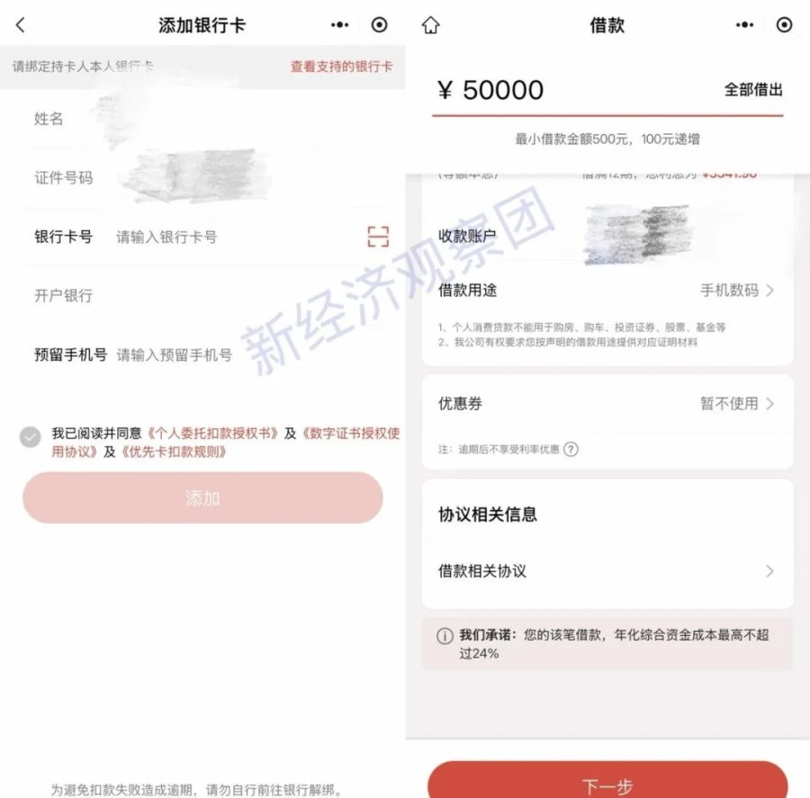 在提交全部信息后,《借款合同》显示,年化利率12%,承诺最高成本不超24%。同时,贷款人有权将合同下的全部或部分权利义务委托给第三方机构行使(包括但不限于逾期款项催收等),并向该机构披露借款人相关信息,借款人对此予以认可且无异议。