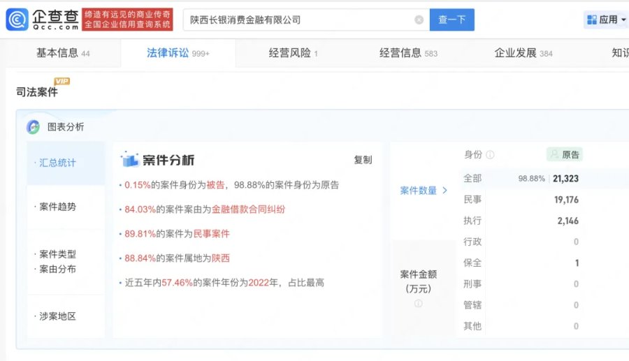 与此同时,长银消金大量通过诉讼方式催收贷款,反映出其面临的贷款逾期风险管理压力较为突出。据企查查数据显示,长银消金涉及的司法案件数量已达21563 起。其中,98.88%的案件中长银消金为原告,84.03%的案件案由为金融借款合同纠纷。年报数据则显示,2024年末,长银消金不良贷款率升至1.93%,较上年的1.89%上升了0.04个百分点。