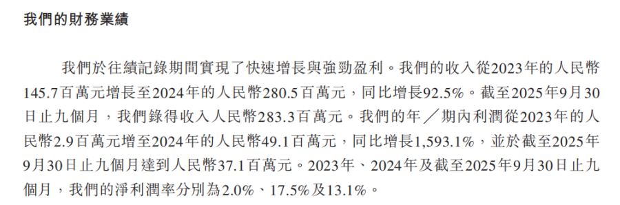 根据招股书披露,公司2024年经营净利润达6481.5万元,较上年增长超三倍;增长势头在2025年进一步延续,仅前九个月经营净利润已实现8642.3万元,接近上年同期利润的两倍。