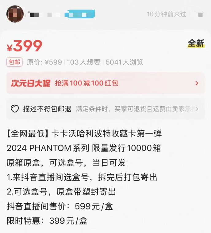 目前,Suplay只在北京设置四家线下门店,销售的主阵地是线上商城,而消费者最容易接触到的是各大直播间。消费者在二手交易平台上能轻易搜索到低价出售的整箱卡牌,而直播间的价位更加混乱而难以监控,在极端情况下甚至低至2-3折。