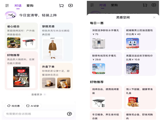 “对话”页面就像一个聊天窗口,你可以用自然语言直接说出自己的购物需求,同时会有“灵感空间”的推荐,分设了好物推荐、外卖下单、穿搭灵感、省心组合、每日优惠五个主题推荐,覆盖了日常购物的主要场景。