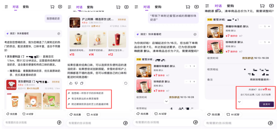 除了基础购物,还测试了外卖点单功能。在询问下单上,如果给出的指示够清楚,它就会自动进行匹配和筛选,你只需点击“去支付”即可,若是模糊的指示,它会优先列举附近各家奶茶店,每段介绍下都携带着京东秒送的店铺链接,并出现后续语言的跟进询问,同样可以选择下单。