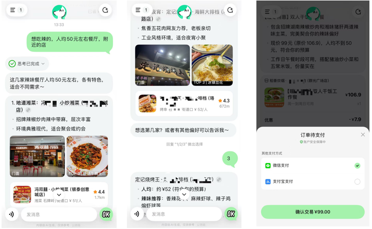 与京东AI购不同的是,美团的优势在于其强大的本地生活服务生态,“小美”的推出,相当于给这个生态装上了“AI大脑”,让用户的生活更加便捷。比如,用户只需对“小美”说“想吃辣的、人均50元左右的餐厅,附近的店”,“小美”就能快速筛选出符合条件的餐厅,并进行详细介绍供选择,甚至支付,这种一站式的服务体验,确实让人眼前一亮。