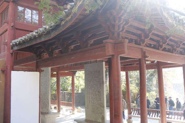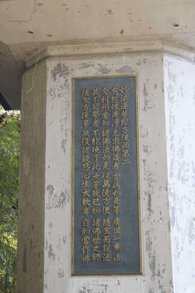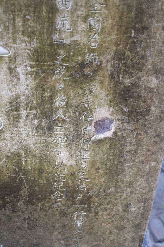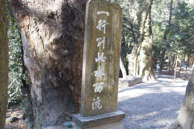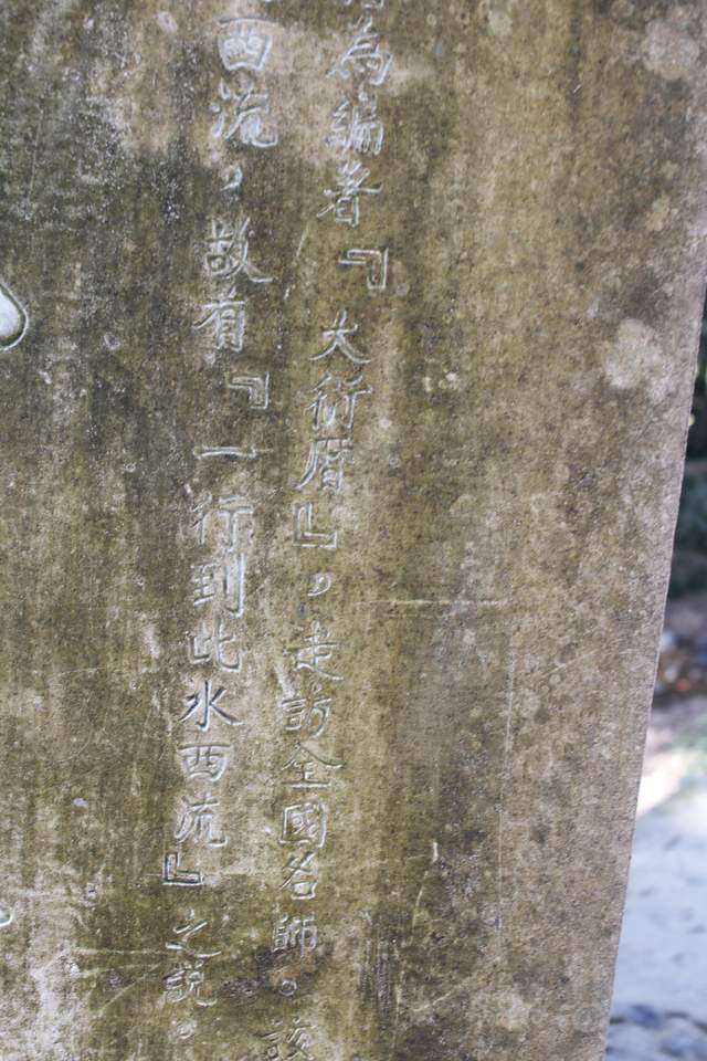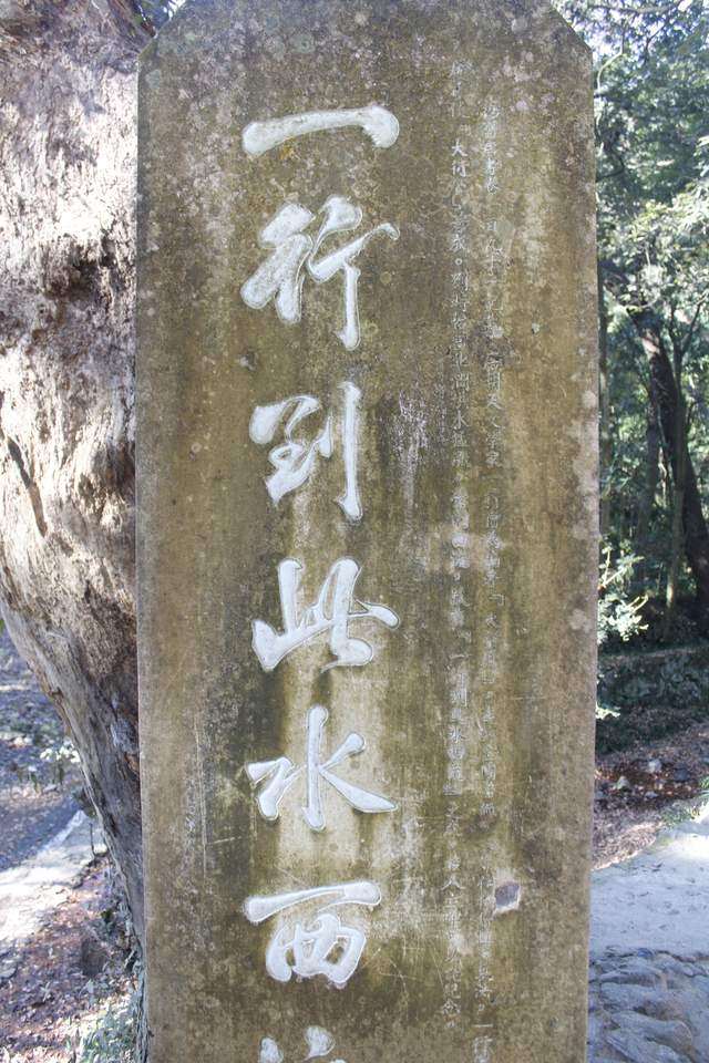 寺院门口有一块碑,上面写着“一行到此水西流”。