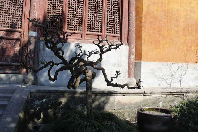 隋文帝开皇十八年(598年),江南总管杨广(即隋炀帝)特地派遣司马王弘到天台,依智者大师生前所画图样,建造了国清寺。寺院大雄宝殿左侧有一座梅亭,亭前花坛植有老梅一株,苍老挺拔,传为天台宗五祖手栽,俗称“隋梅”,大概是我国现存最老的一棵梅树了。(文旅君)