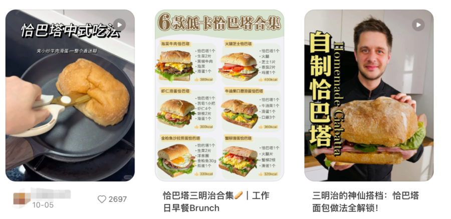 在小红书搜索“恰巴塔”三个字,就可以打开一个“万物皆可恰巴塔”的世界。当恰巴塔里加上巧克力碎,得到的就是一款既有麦香又有甜美巧克力风味的传统甜品;如果在面团里加上葡萄干、苹果干等酸甜口味的水果干,那么在感受面包绵软的口感的同时,又能品尝到酸甜果香带来的清新风味;假如在恰巴塔里夹上生菜、鸡蛋或者火腿,那么这块小小面团就会立刻化身mini汉堡,给人大大的满足。