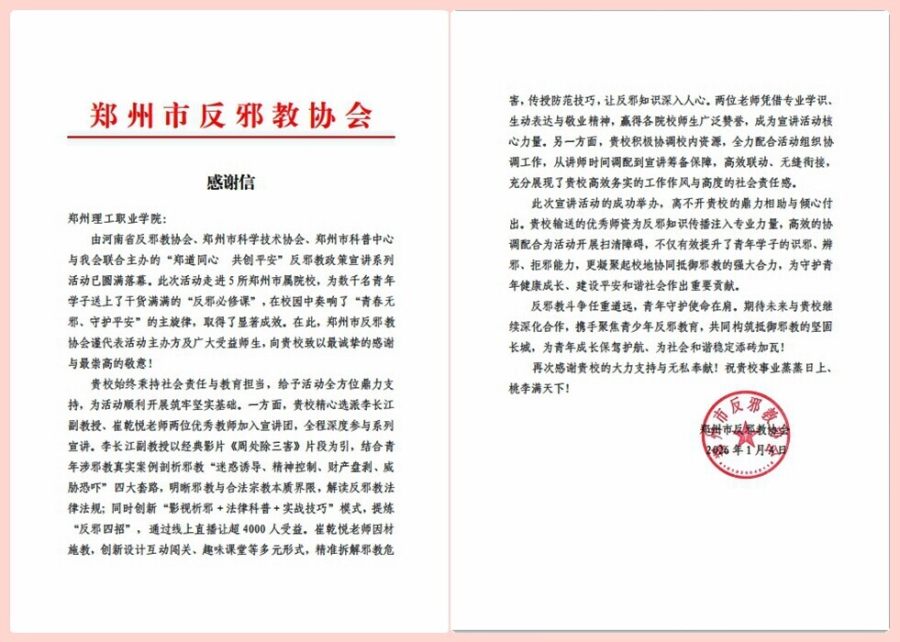 近日,郑州理工职业学院收到郑州市反邪教协会发来的感谢信,对该校在“郑道同心 共创平安”反邪教政策宣讲系列活动中给予的大力支持和突出贡献表示诚挚的感谢与崇高的敬意。