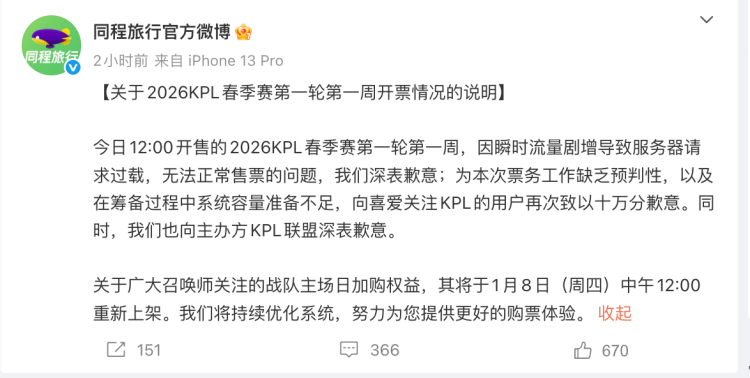 1月7日,同程旅行通过官方微博就2026年KPL王者荣耀职业联赛春季赛门票开售故障一事,向赛事主办方KPL联盟及广大用户公开致歉。