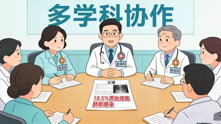 入院时,王强的病情已十分危急:骨髓穿刺显示疾病进展,原始细胞占比18.5%,随时可能转化为急性白血病;肺部真菌感染、心脏因长期重度贫血出现左室肥厚……重重难关,摆在了医院血液一科团队面前。