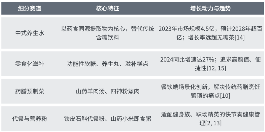 Z世代对“国潮养生”表现出极高的忠诚度,他们更倾向于将中医药理融入碎片化的生活场景中。药食同源代餐产品凭借“食补代替药补”的逻辑,成功切中了职场人调理体质、抗疲劳、改善睡眠的刚性需求[13]。这种趋势促使产品形态从沉重的传统膏方、酒饮,迅速向轻便的零食、即饮茶及功能性软糖转化。