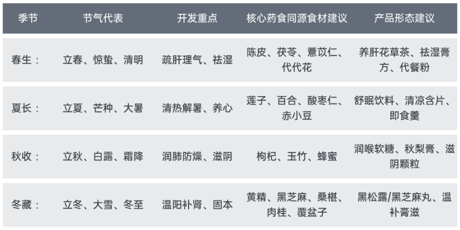 开发这类产品时,必须遵循中医的整体观,将时间(节气)、环境(地域)与人体需求(体质)统一。时(Timing): 针对节气更替中的气温、湿度、光照变化(如:冬至一阳生,春分阴阳半)。位(Target): 针对不同季节易受损的脏腑(如:春升补肝,夏清补心,秋润补肺,冬滋补肾)。性(Property): 利用药食同源食材的“四气五味”平衡人体(如:夏季用寒凉清热,冬季用温热散寒)。效(Efficacy): 解决现代人的亚健康痛点(如:春季祛湿、夏季解暑、秋季润燥、冬季固本)。为了方便开发规划,可将二十四节气按“四季”划分为四大产品系列: