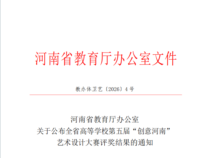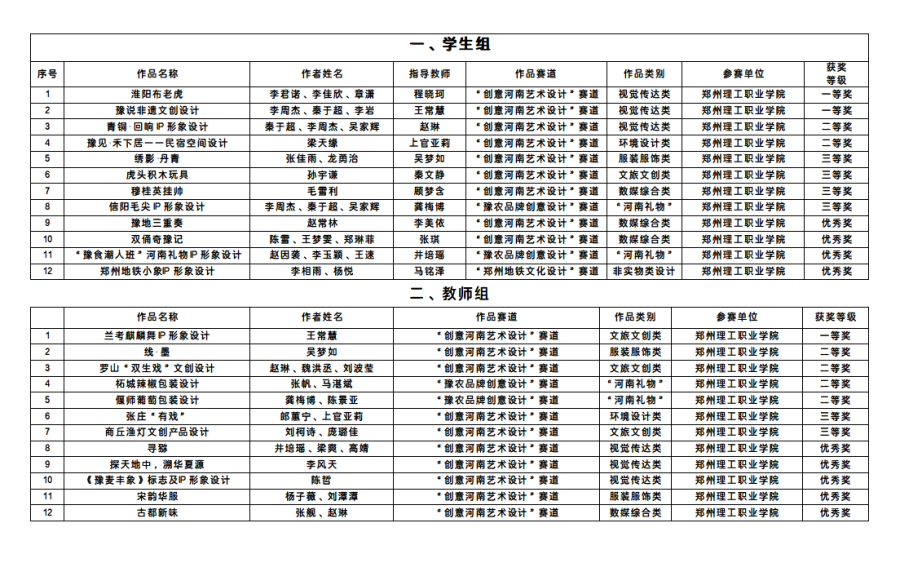 近期,郑州理工职业学院艺术传媒学院师生在省教育厅主办的全省高等学校第五届“创意河南”艺术设计大赛中凭借出色的创意构思与精湛的制作水准,从众多参赛作品中脱颖而出,学生组和教师组共斩获省级奖项24项,其中一等奖3项,二等奖6项,三等奖6项,优秀奖9项。