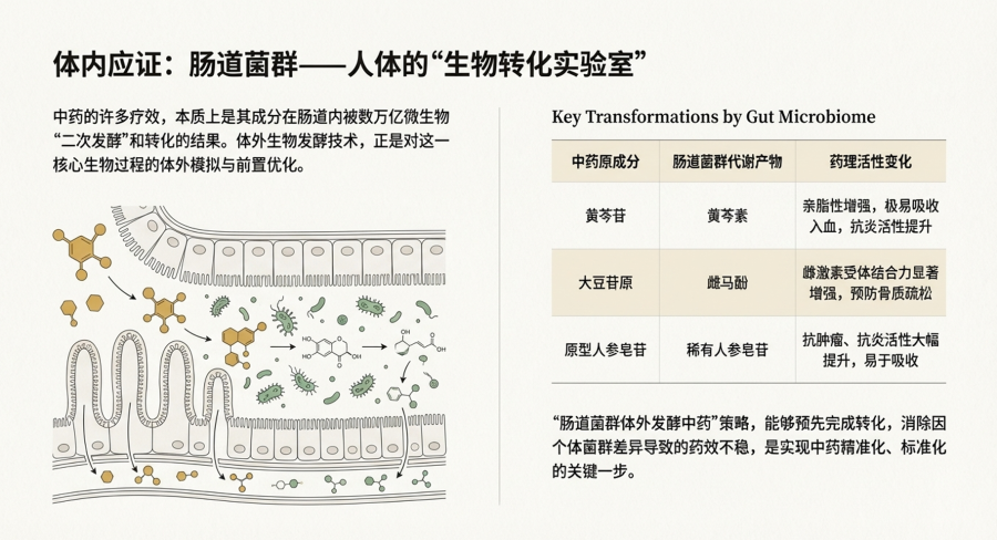这种交互作用揭示了中药疗效存在个体差异的根本原因:不同个体的肠道菌群组成不同,导致同一方剂在不同人体内的转化效率和产物谱系存在显著差异[3]。基于此,现代研究提出了“肠道菌群体外发酵中药”的设想,即利用复合肠道菌种在体外模拟人体代谢,预先将中药转化为易吸收、高活性的形式,从而消除个体差异,实现中药的精准标准化[3]。