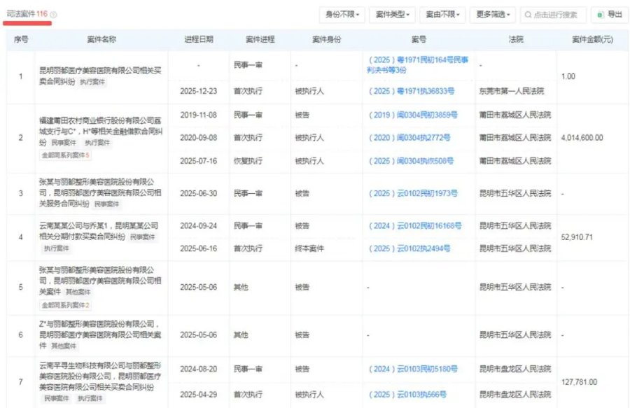 然而,好景不长。自2018年中旬从新三板退市后,无锡丽都医美便开始陷入一系列困境之中。从天眼的数据来看,其司法案件数量多达116条,裁判文书89条,立案信息37条,开庭公告55条。这些冰冷的数据背后,是医院在运营过程中不断产生的各种纠纷和问题。