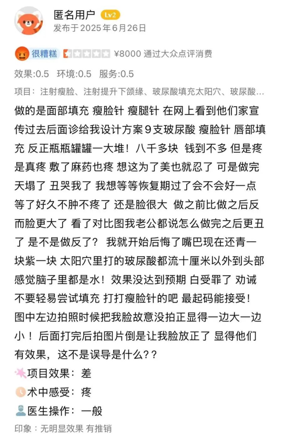 当然,这还不是无锡丽都医美最过分的地方,有消费者在无锡丽都医美做完项目后,发现效果不佳,本想着事情到此结束。