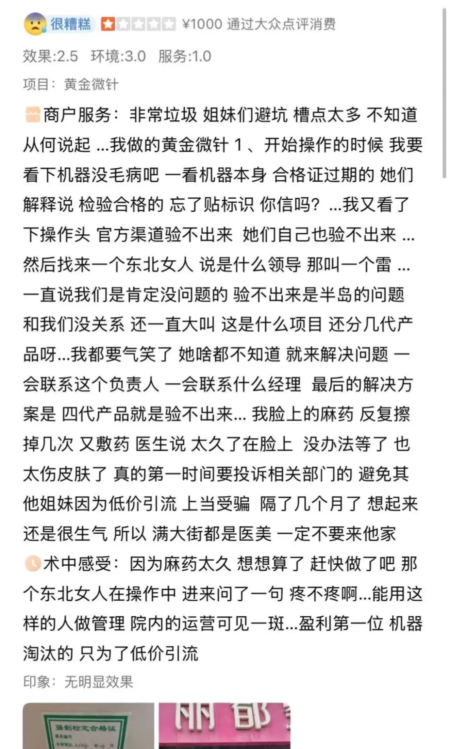 还消费者冲着无锡丽都医美“低价黄金微针”的宣传,到点后却发现治疗设备合格证过期、操作头无法通过官方渠道验真。而院方先以“忘了贴新标签”搪塞,后又搬出“四代产品就是验不出来”的荒唐说法。