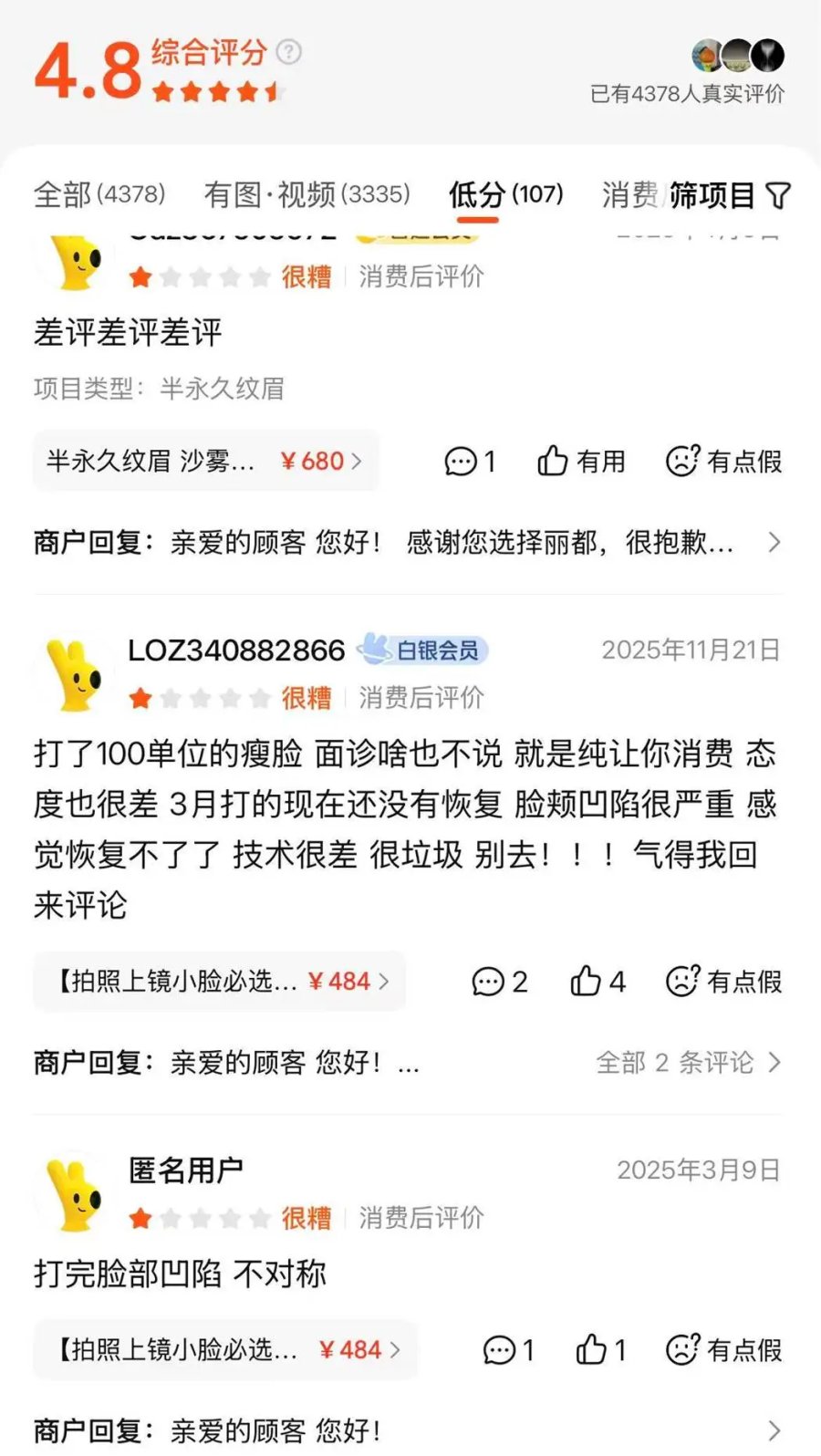 在美团上,“再也不来”成默认标签,口碑反向冲榜。体验感非常差、再也不会去第二次、医院售后服务很差、欺骗消费者、医院服务不是很好........等评价随处可见。