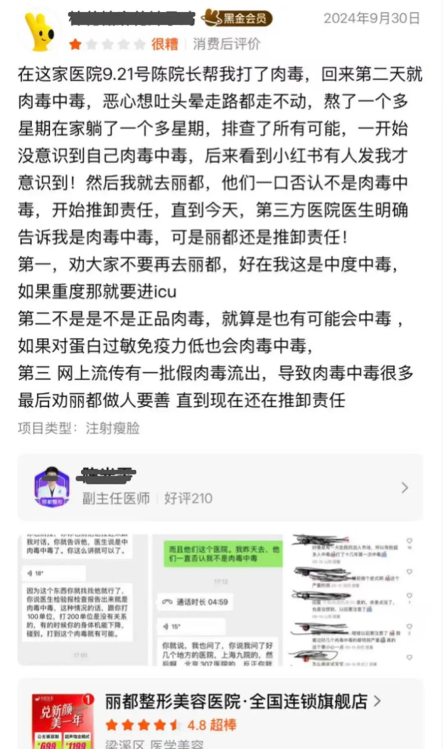 9月21日,一位消费者在无锡丽都医美注射肉毒后,次日即出现恶心呕吐、头晕至无法行走的典型肉毒中毒症状,被迫卧床一周。