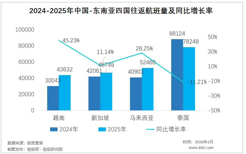 纵观2025年中国往返东南亚四个主要国家的航班量变化,越南简直是一飞冲天。