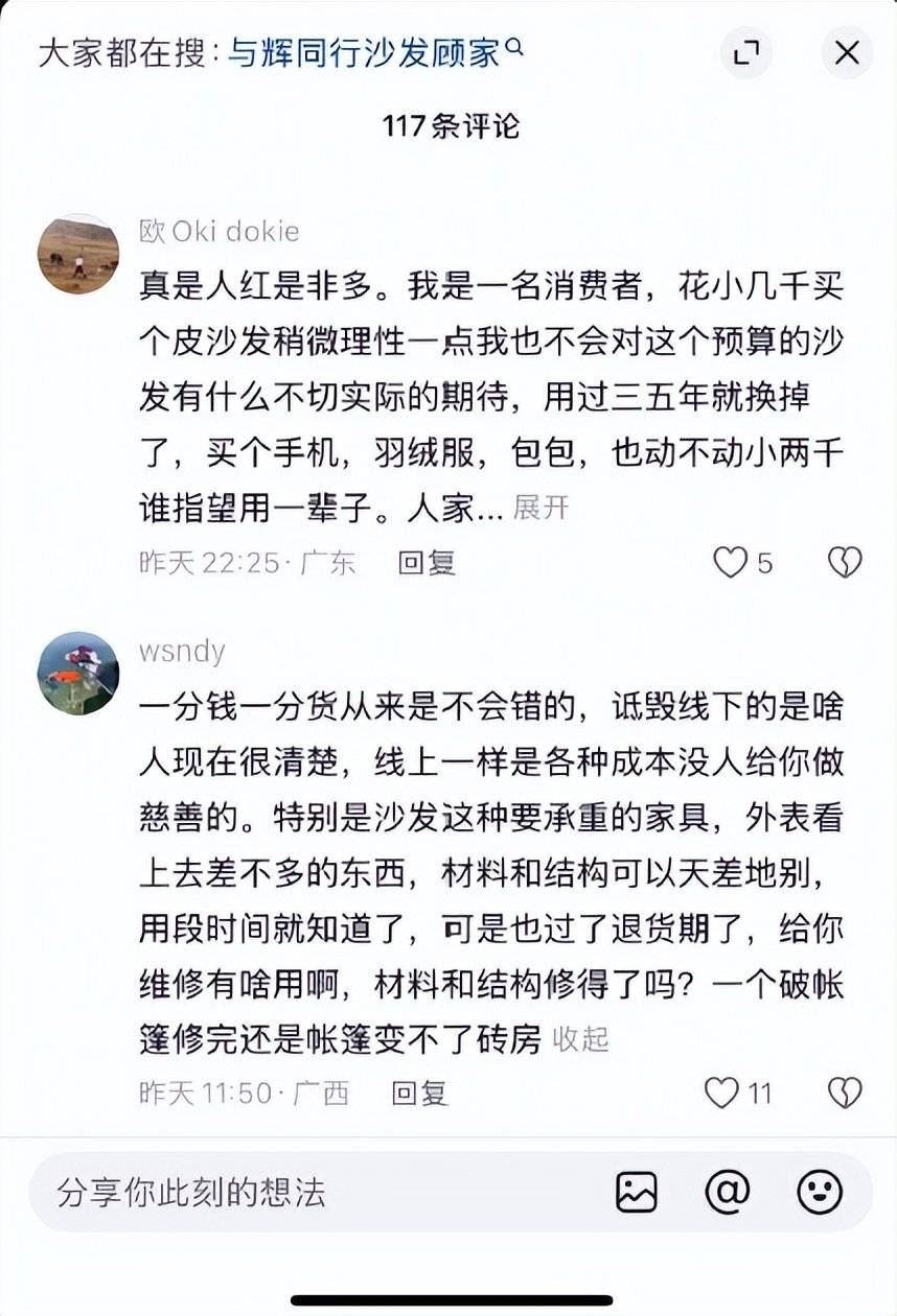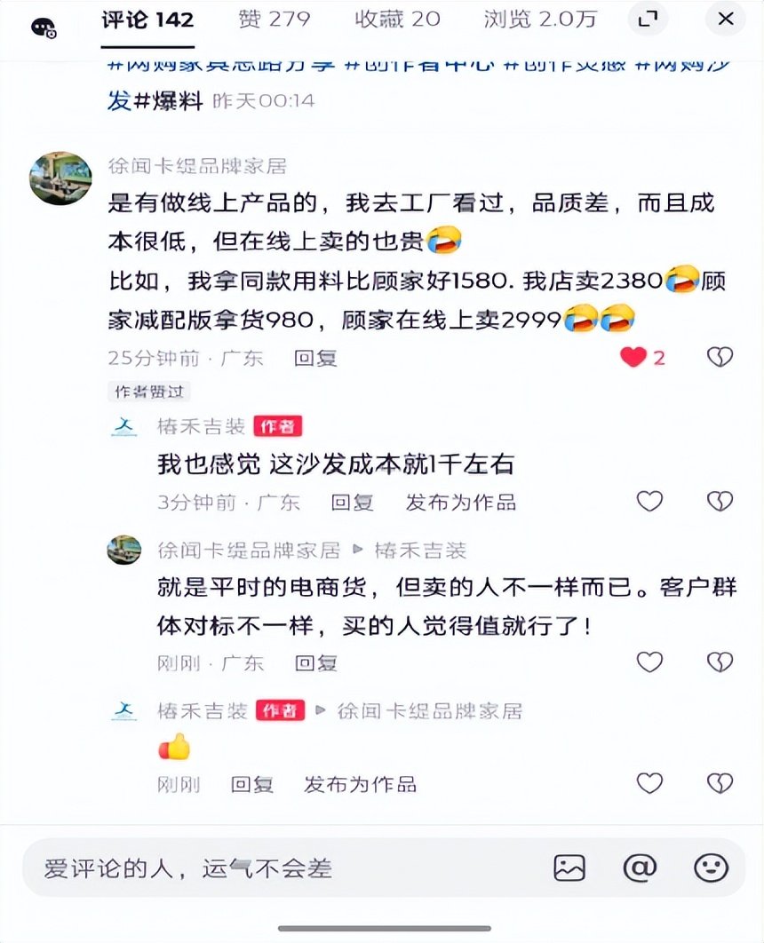 尽管直播中,董宇辉已多次强调该款沙发为直播间定制款,是“接触面真皮”而非全皮,但“赔本赚吆喝”“顾家找代工”等声音仍甚嚣尘上,不乏经销商和行业从业者放话,“大牌低价必有内幕”。