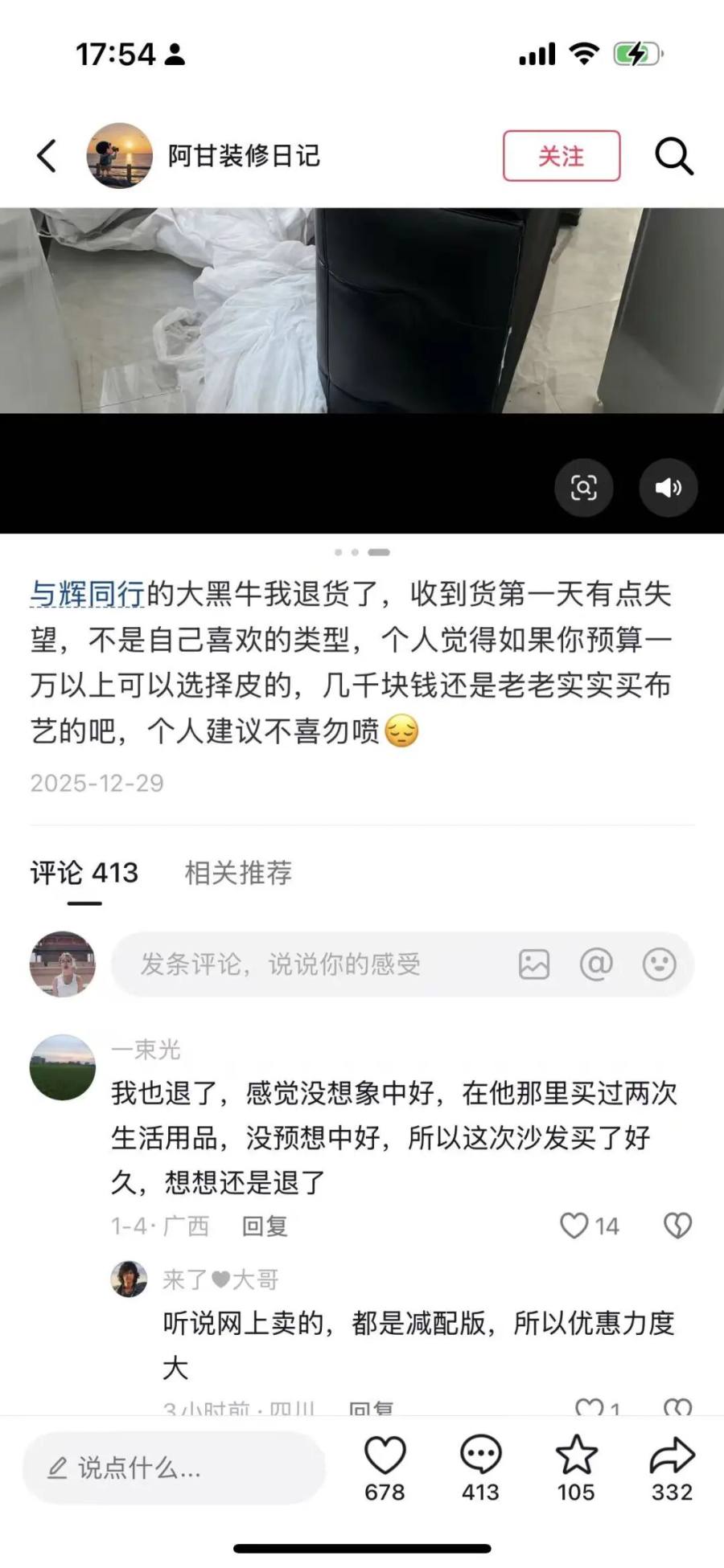 在收货评论中也显示出不同的体验。有人庆幸“明码标价,物超所值”;也有人在收货后发现质感与线下预期不符,愤而退货。董宇辉直播间给出了“无论是否为质量问题,退货均不需支付运费”的承诺,以极高的售后成本来消除大件商品的购买门槛。