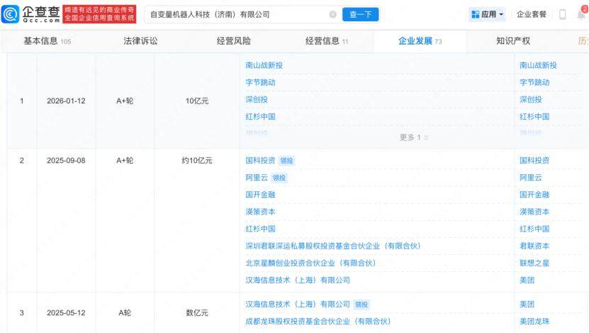 技术上的领先,让自变量获得了资本市场的青睐。企查查信息显示,自变量机器人已累计获得9次融资,融资至A++轮,其中更有2025年5月美团独投的数亿元A轮融资,以及9月份阿里云的参投。