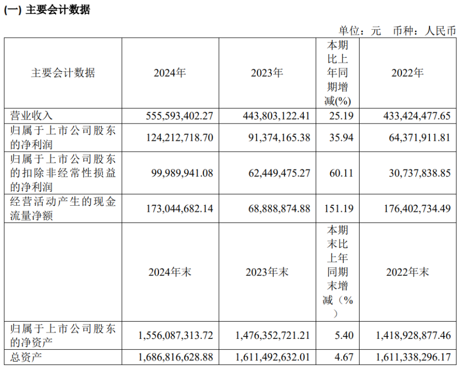 2024年,嘉必优实现营业收入5.56亿元,同比增长25.19%;归属于上市公司股东的净利润为1.24亿元,同比增长35.94%。
