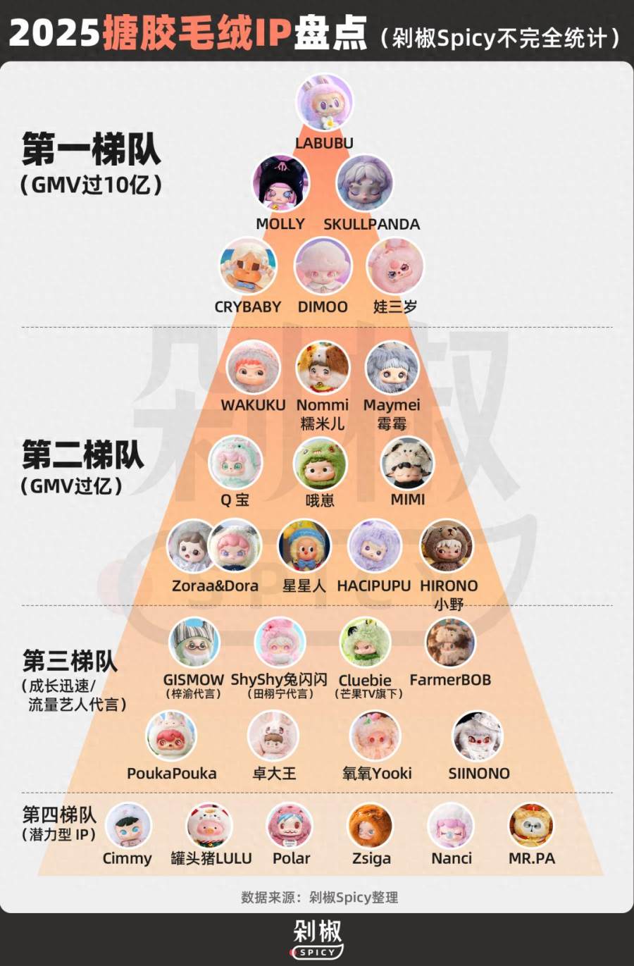 基于公开销售数据,我们将搪胶毛绒 IP 划分为清晰的四级金字塔: