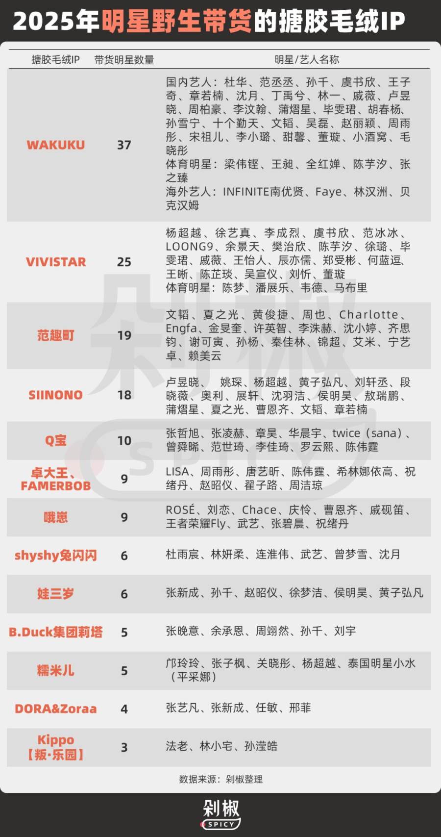 据剁椒Spicy不完全盘点,今年不少新兴搪胶毛绒IP都都选择了明星野生带货模式,单个IP最多请来了37个明星站台,且明星艺人圈层涵盖了海内外娱乐圈和体育圈。