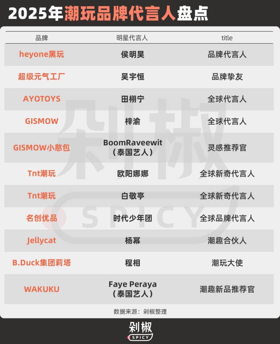 不过,越来越多的带货贴堆积下,消费者已经对同质化严重的带货内容产生麻木感。因而,不少潮玩品牌们转向明星背书更强的代言人合作模式。据剁椒Spicy不完全统计,当前共有11个潮玩品牌官宣了代言人,代言人title既有全球品牌代言人这类重量级,又有单个搪胶毛绒IP推荐官的轻量级合作。