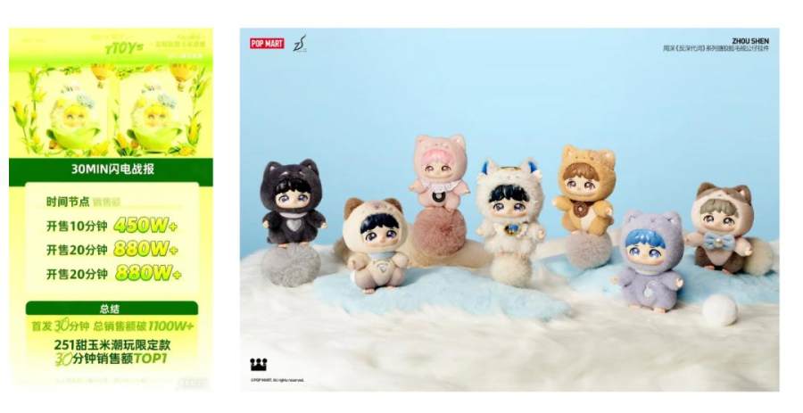 赛道竞争不仅限于传统潮玩品牌,一批 “黑马玩家” 横空出世,仅用不到一年时间便实现销售额破亿的跨越式增长;与此同时,手握海量明星、艺人资源的平台也嗅到商机,纷纷入局分羹,让赛道生态更加多元。