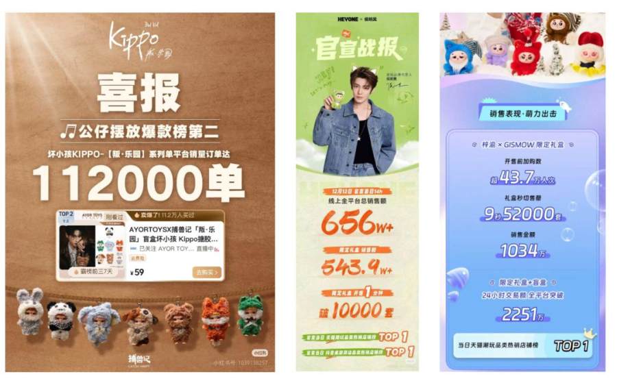 11月,GISMOW请来梓渝担任全球代言人,与艺人梓渝合作的限定礼盒首日销售额达2251万元;12月,黑玩旗下的搪胶毛绒IP哦崽官宣了热门演员侯明昊成为品牌代言人,首日哦崽IP搪胶毛绒日销量达到了656万+。