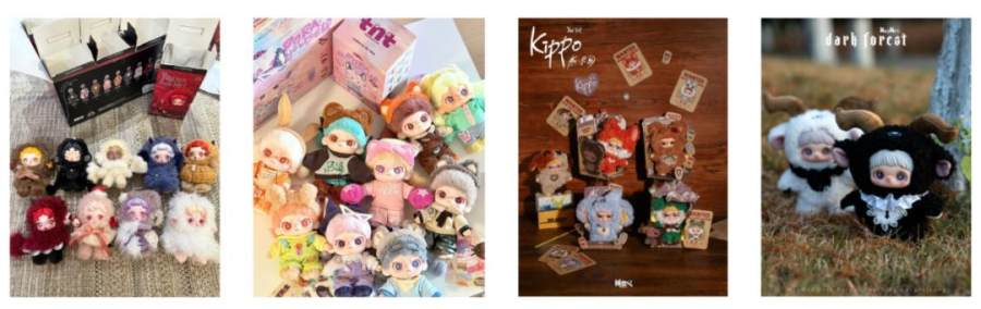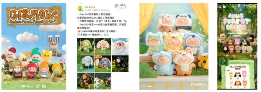 2)森林系列:绒绒怪茸茸森林、Sanrio characters森动系列搪胶毛绒、Dumia 森林家族系列搪胶毛绒、HALUU森林奇遇系列、GISMOW奇幻森友系列盲盒等;