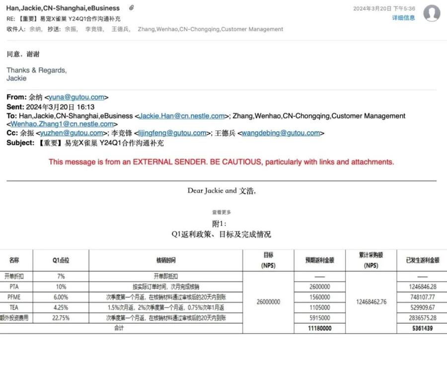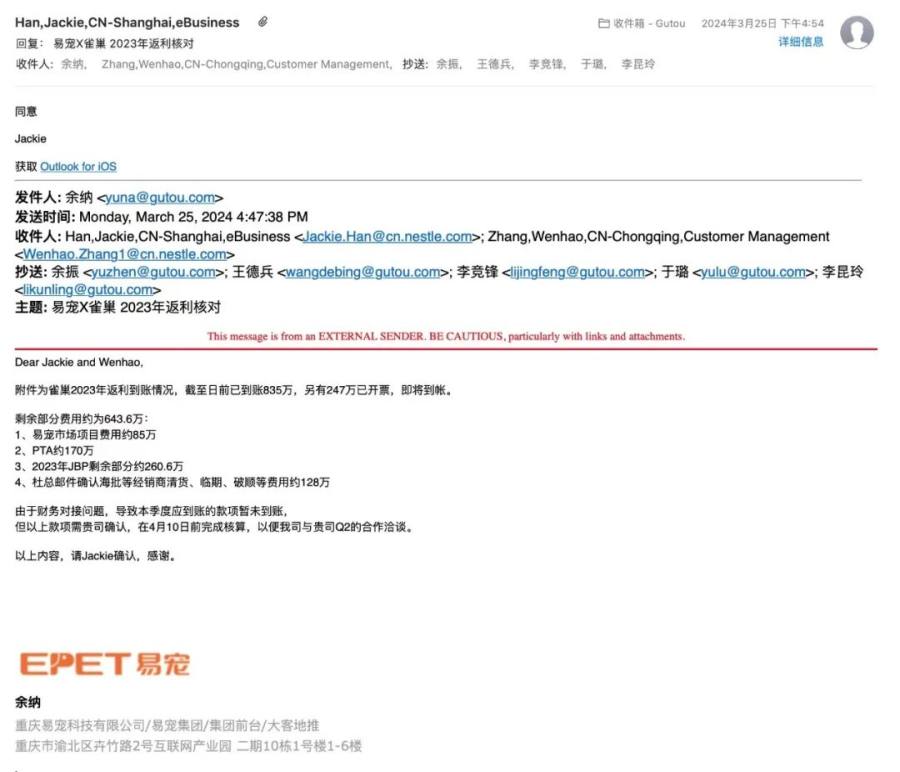 易宠与雀巢2023年返利核对邮件,图片由受访者提供