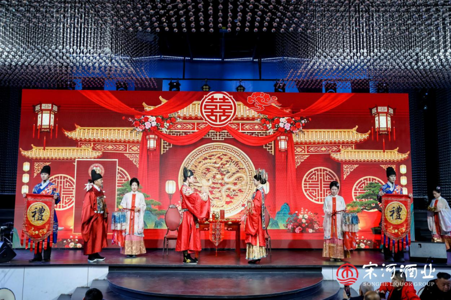 办宴席,素有“无酒不成席,无酒不成礼”说法,婚俗文化与酒文化可谓天然契合。在“纵情向前——2026宋河酒业喜总之夜”现场,著名中式婚礼主持人张博,为到场喜总和宋河酒仓合伙人现场演绎汉婚全流程。“2025年,宋河提出‘有喜事,红宋河’,聚焦‘人生12喜和36宴’喜事文化,跟结婚生子、金榜题名、佳节团圆场景强绑定。在一亿河南人的重大喜悦时刻,宋河粮液始终是宴席餐桌上最亮眼的那抹红”,李金智说。