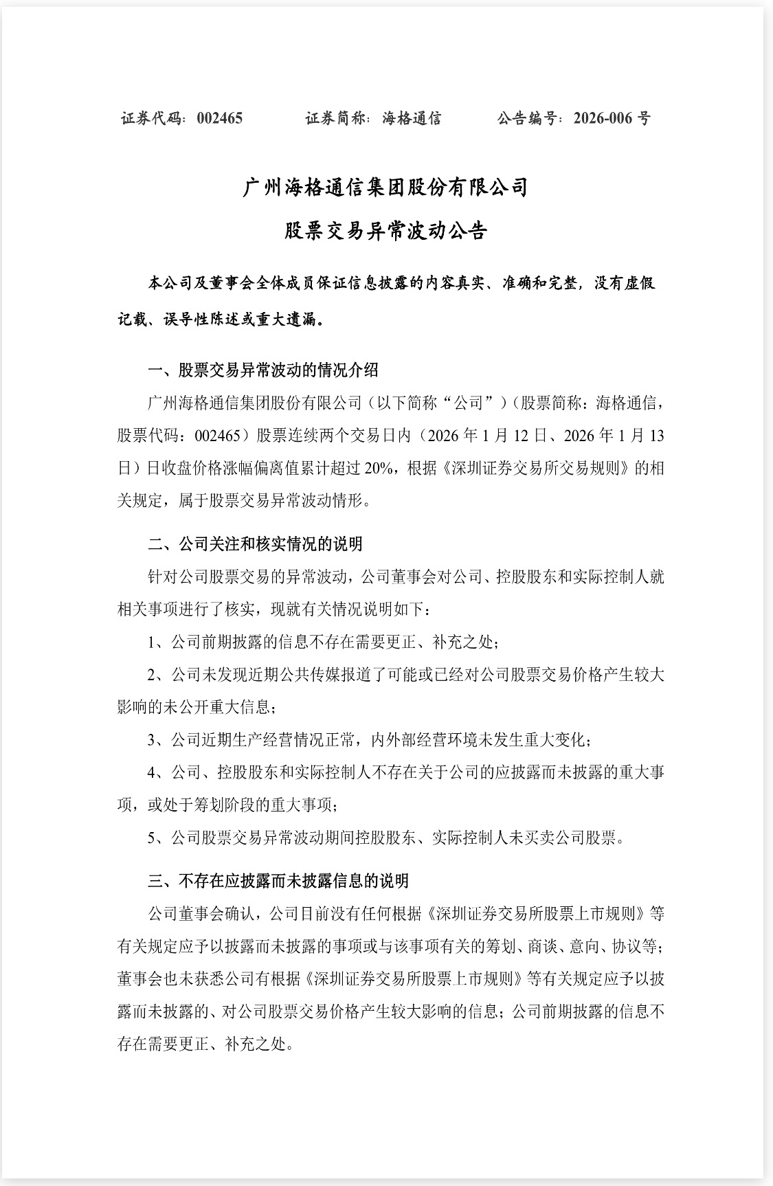 海格通信1月13日公告,公司股票连续两个交易日内(2026年1月12日、2026年1月13日)日收盘价格涨幅偏离值累计超过20%,根据《深圳证券交易所交易规则》的相关规定,属于股票交易异常波动情形。
