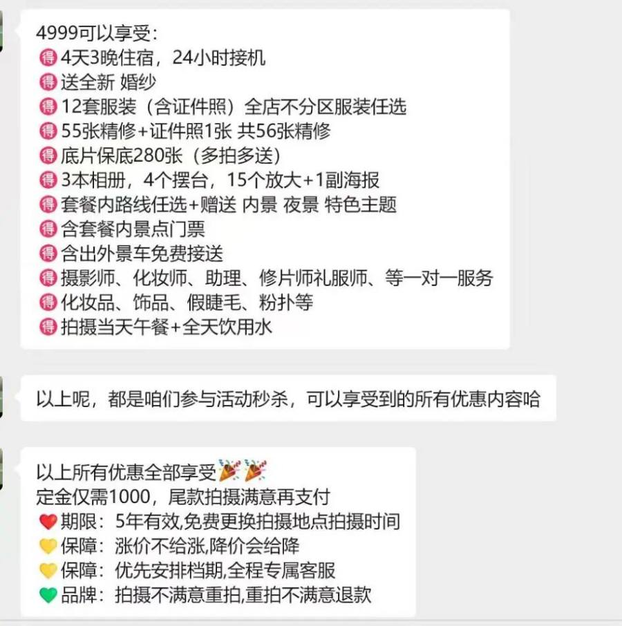 其次,就是有不少商家利用了婚拍游客 “ 沉没成本高 ” 的特点,先低价引流让客户来到丽江,随后提供与前期宣传不符的服务或是引导客户进行增项消费。